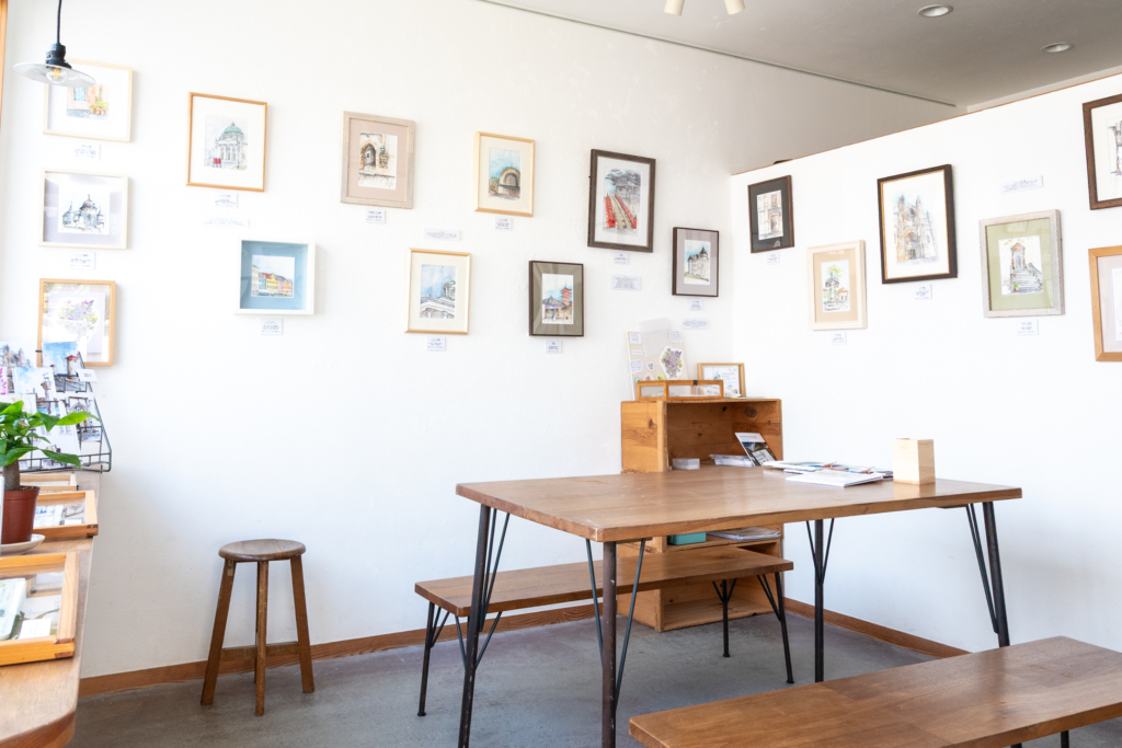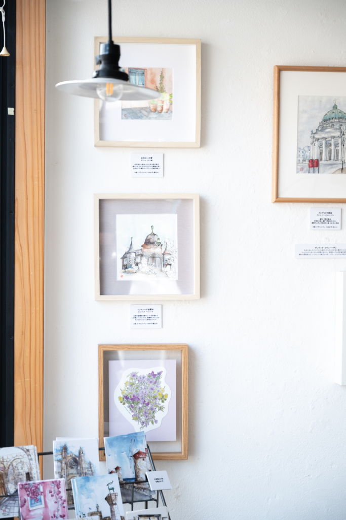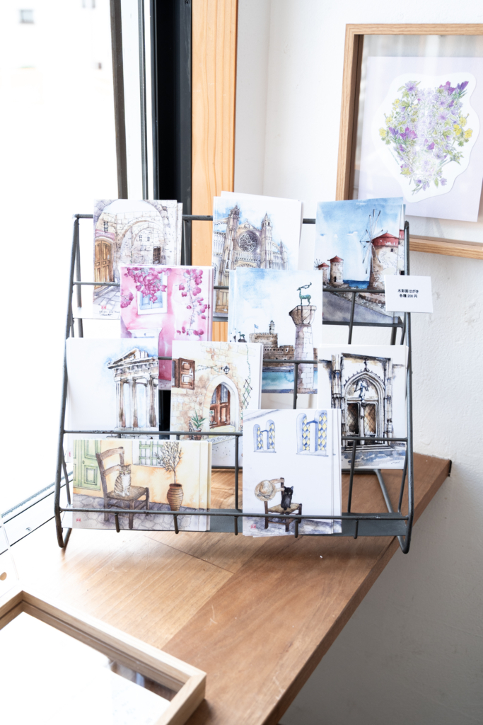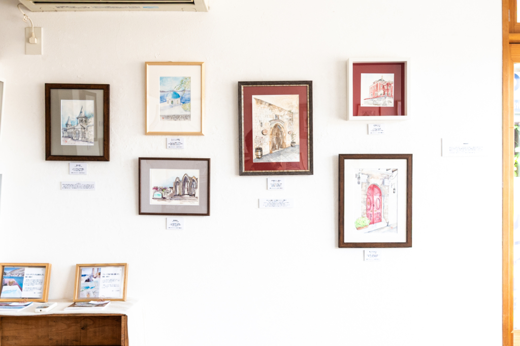 本作品展では、現在住んでいるギリシャのロドス島の風景を中心に、ヨーロッパ他国や一時帰国中に日本で描いた水彩画、一緒に旅してきたスケッチブックを展示しています。ぜひご覧いただければ幸いです。