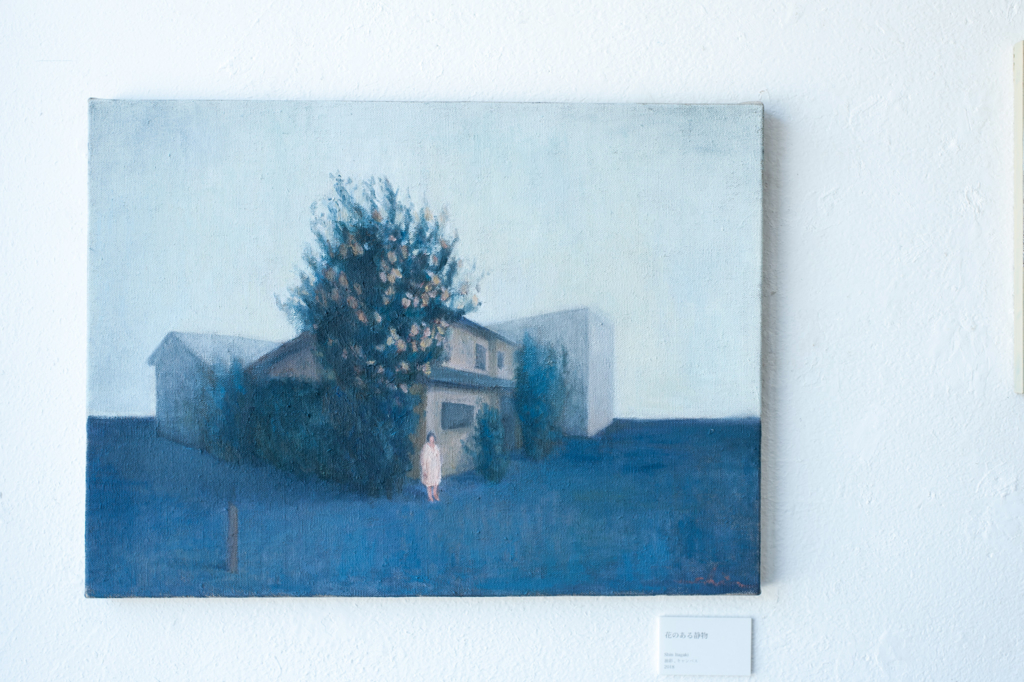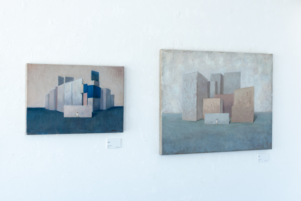 都会のビル群や家などの風景を、不思議な空間に柔らかな色彩で描く板垣晋。それぞれの絵には一人の人が繰り返し描かれ、絵と絵、人と人が繋がり、広がっていくようです。