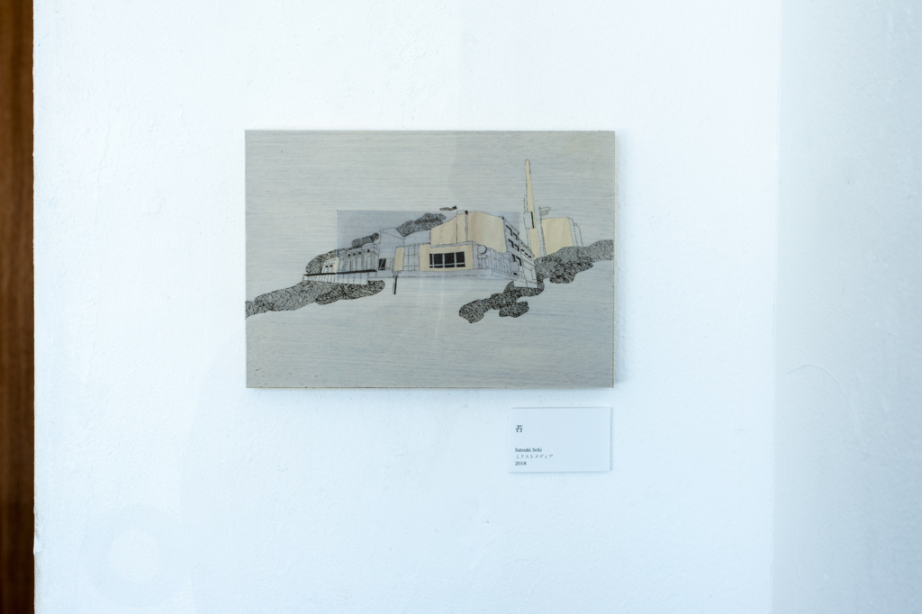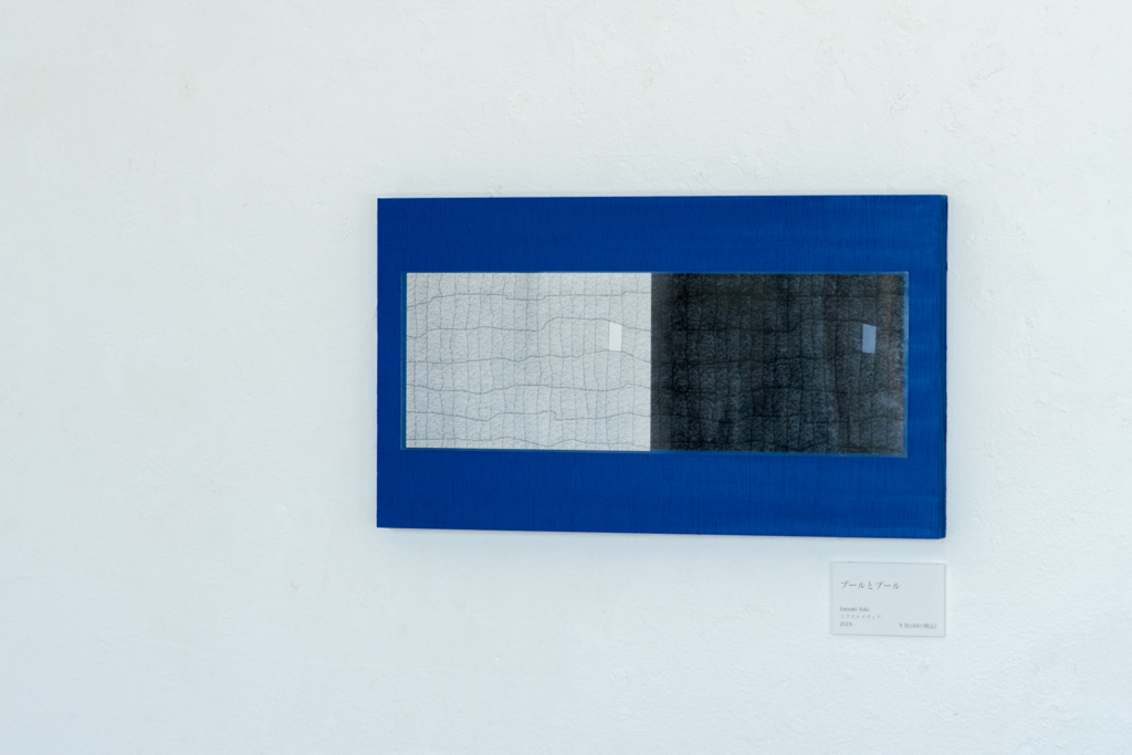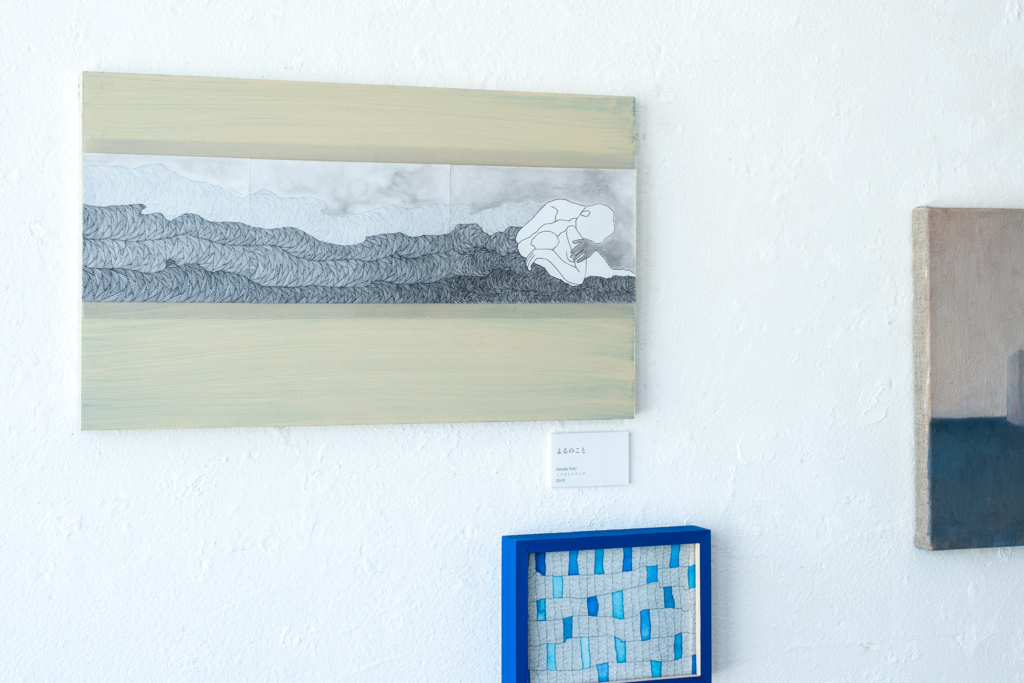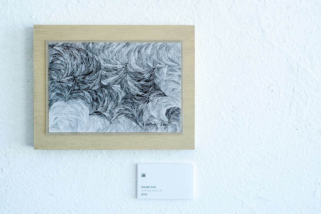 短い直線を並べ、まるで糸を紡いでいくかのように作品を描く関沙月。幾重にも重ねられる直線は、繭のような柔らかさや、流れる水のような心地よさを感じさせます。