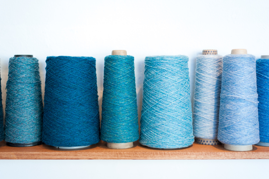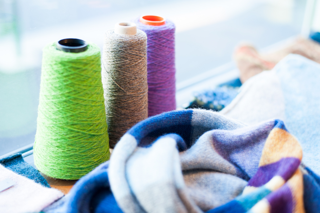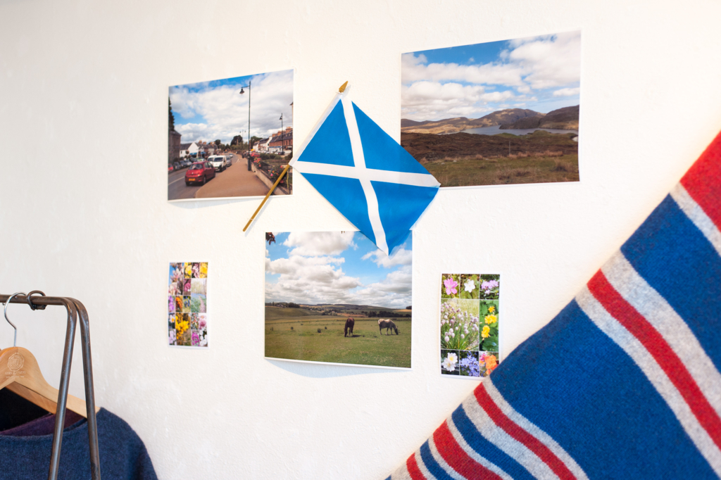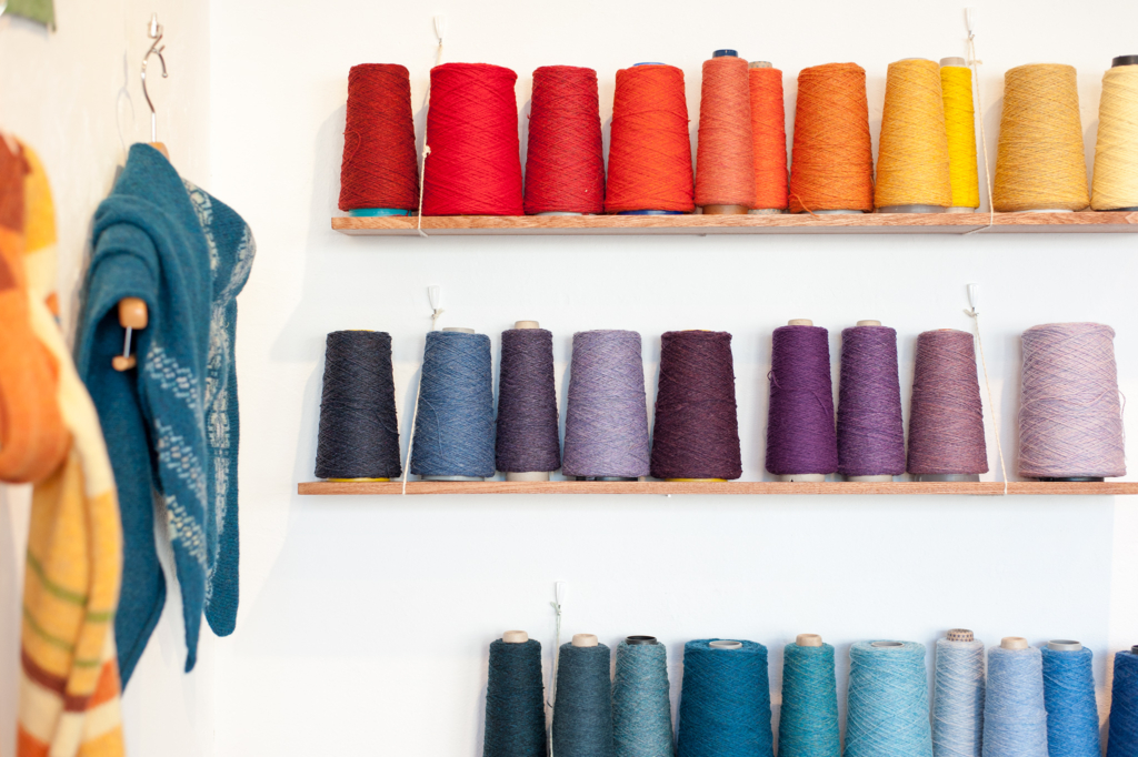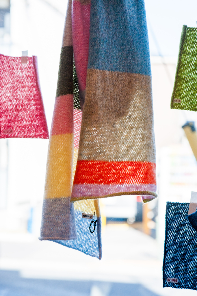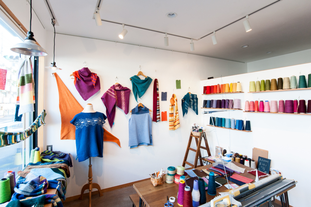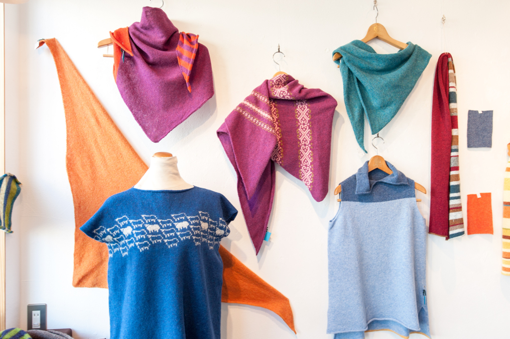 英国スコットランドの毛糸とその糸を使って編み上げたニットウェア や ストール をギャラリーに所狭しと並べます。