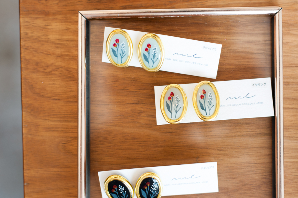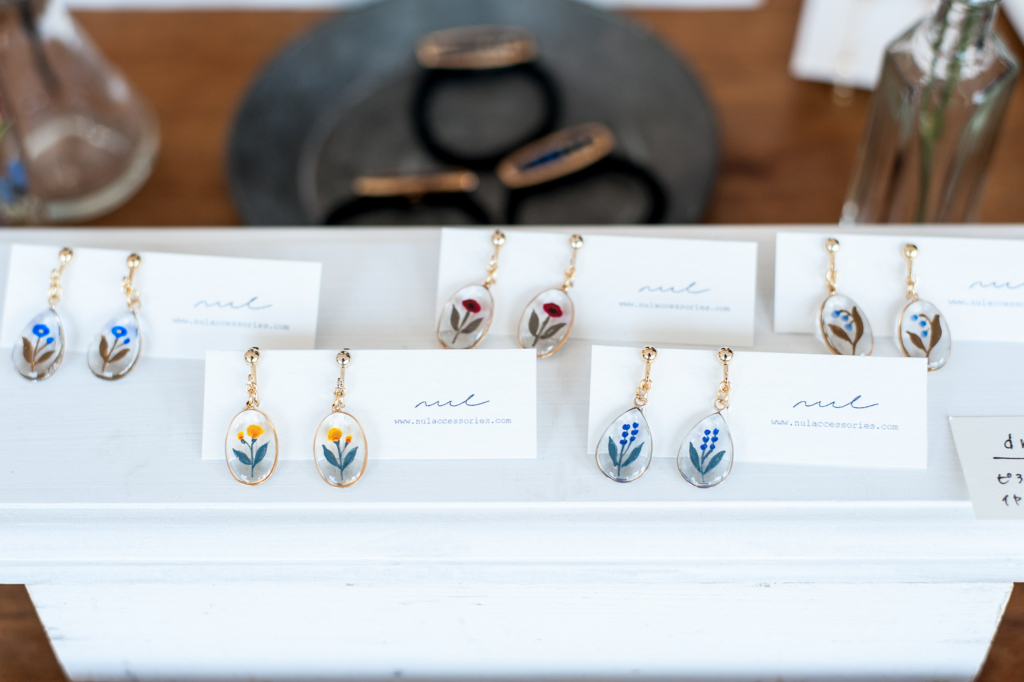 ひとつひとつ手で描いたお花のアクセサリーと、アロマワックスバーやドライフラワーのブーケ、ハーバリウムなどのお花をメインとした雑貨を集めた3日間のみの限定ショップです。