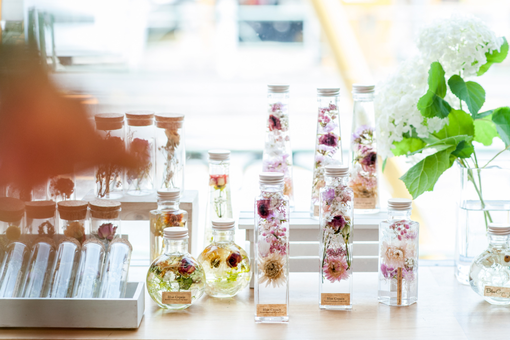 ドライフラワーを用いたオリジ ナルのアロマワックスバーやハーバリウムなどを制作。