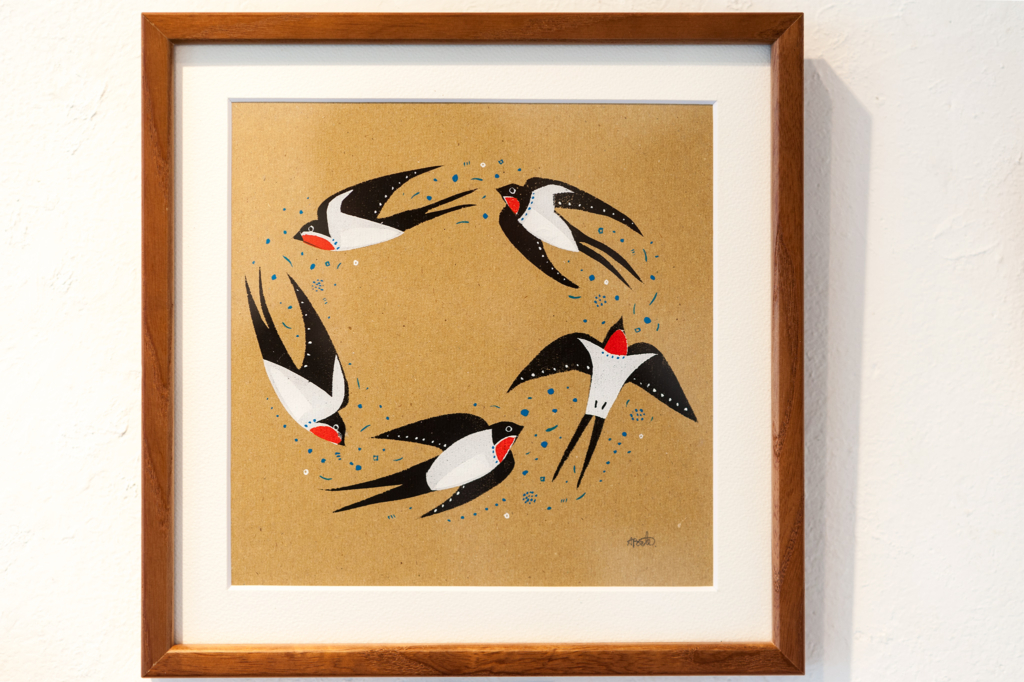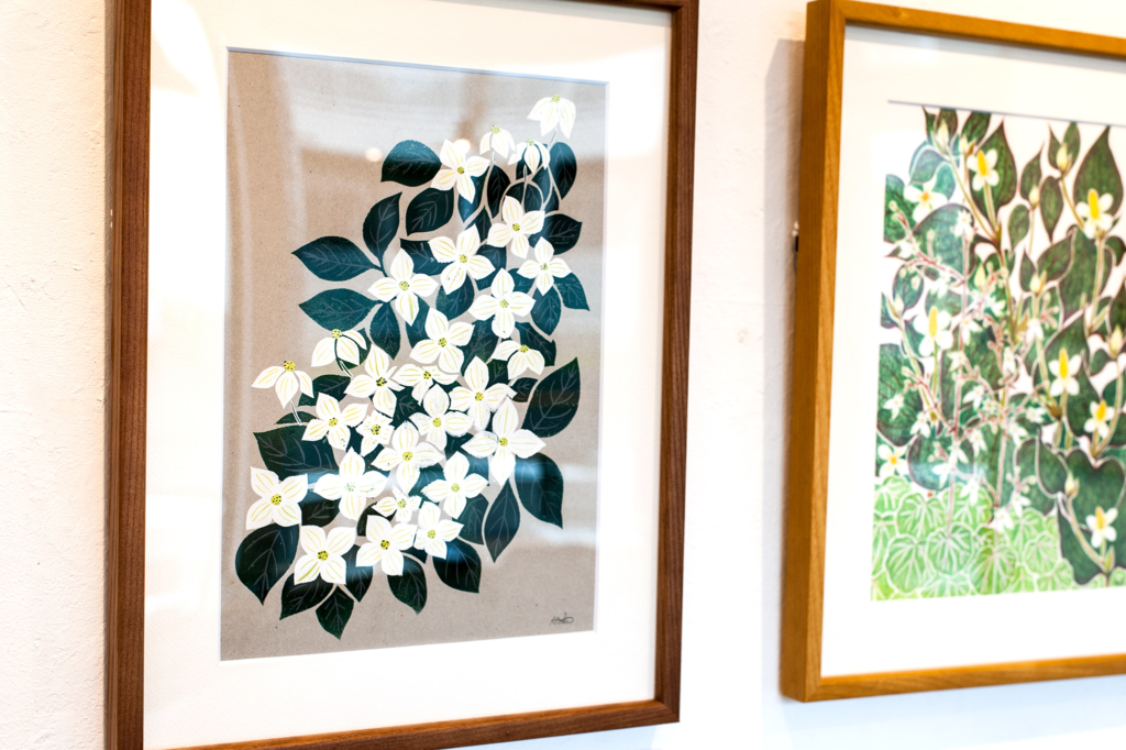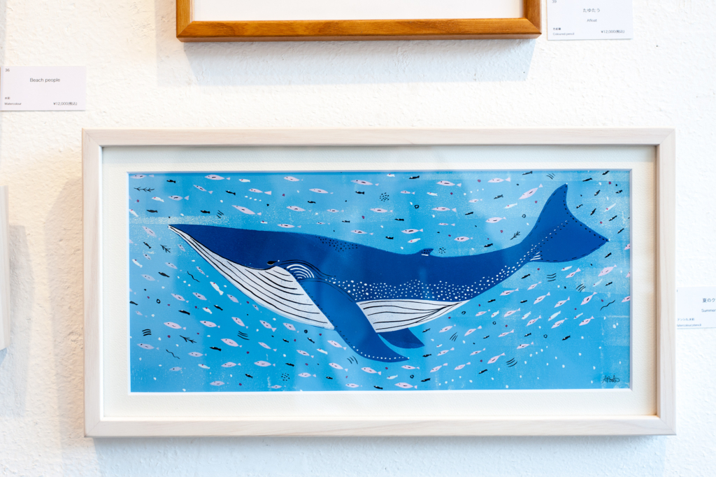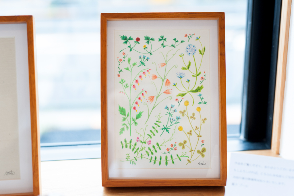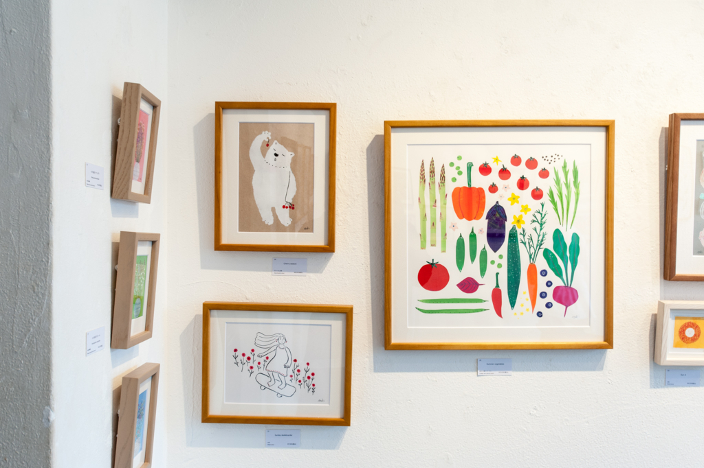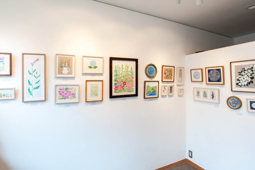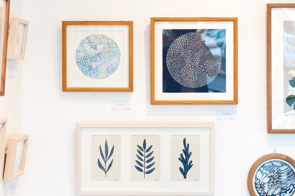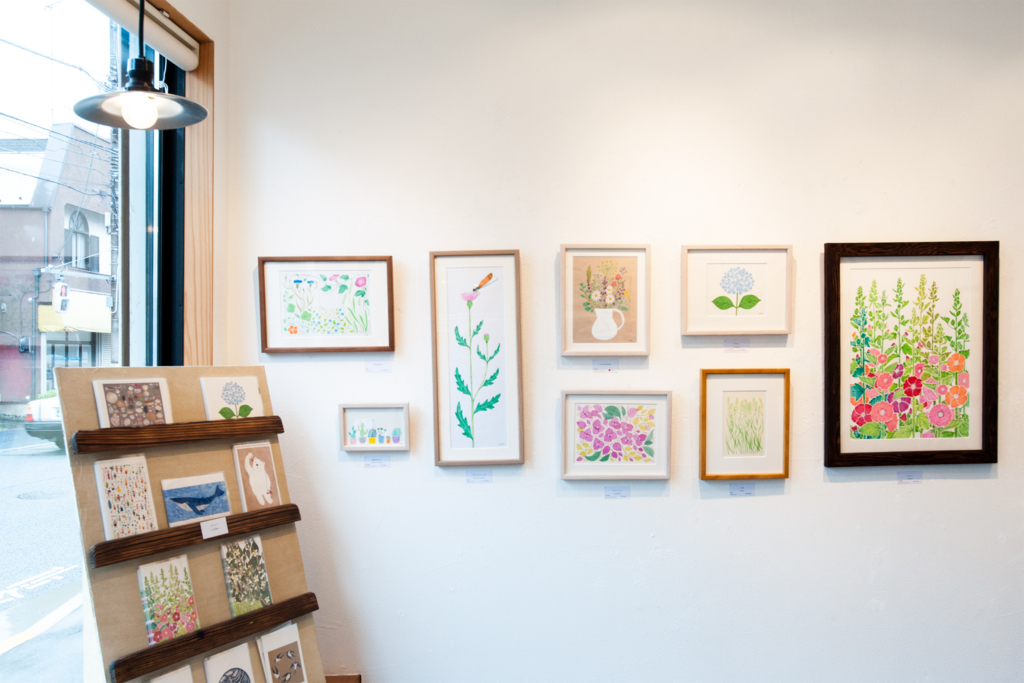 絵画作品と、ポストカードなどの販売